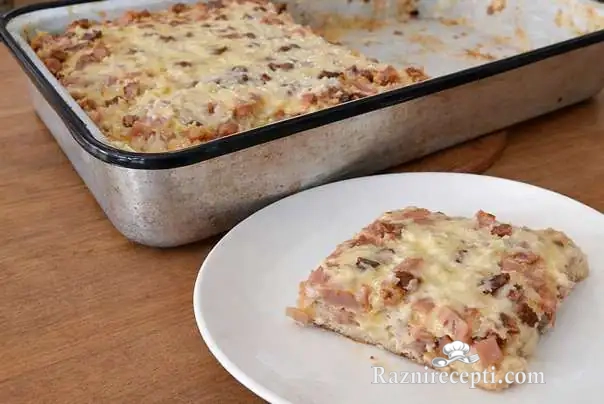 - U umućenu smesu od jaja i mleka dodajte naseckanu salamu i kobasicu, pa sve dobro promešajte. Prelijte ovu smesu preko hleba u tepsiji.