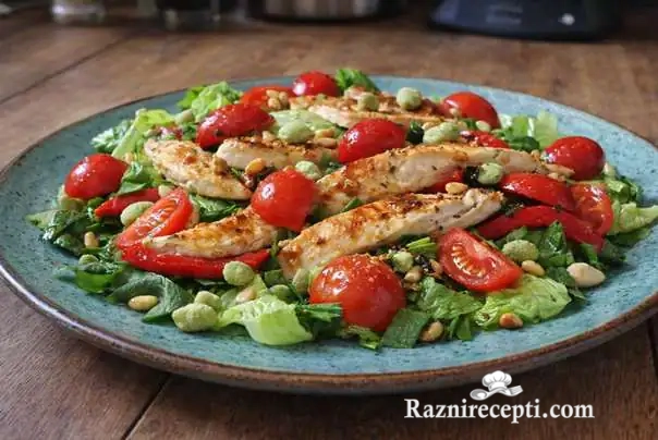 • Zelenu salatu posolite, prelijte maslinovim uljem i limunovim sokom (ili sirćetom). Preko poređajte piletinu, pečenu papriku i seckani paradajz. Ponovo lagano poprskajte maslinovim uljem, dodajte malo bibera i pospite seckanim kikirikijem.